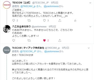 音響機器メーカーのティアック株式会社(本社:東京都多摩市落合1-47、代表取締役社長:英 裕治、以下 ティアック)の業務用音響機器ブランドTASCAM(タスカム)とサロンシェアNO.1ドライヤーメーカー*であり、理美容電化製品ならびに小型家電製品の販売をおこなうテスコム電機株式会社(本社:東京都品川区、代表取締役社長:楠野 寿也、以下 テスコム)は、Twitterユーザーによる【TASCAM(タスカム)】と【TESCOM(テスコム)】の言い間違いからTwitter担当者(以下 中の人)同士が偶然に出会い、そのわずか3週間後に赤ちゃんが泣き止むドライヤーの音によるASMR特集のニコニコ生放送で共演をいたしました。