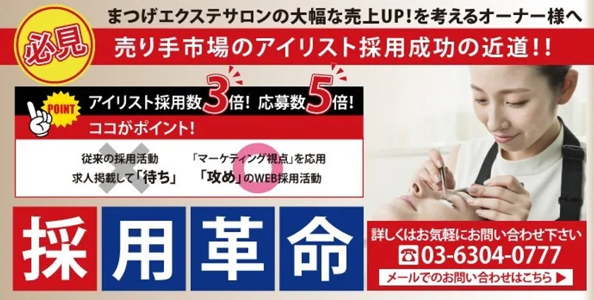 【アイリスト採用革命特別セミナー】10/15(火)東京・新宿開催 まつげエクステサロン経営者必見! 超アイリスト不足時代を乗り切り、業績アップ! たった3ヶ月で経験者採用4名!採用店の実例大公開!&質疑応答