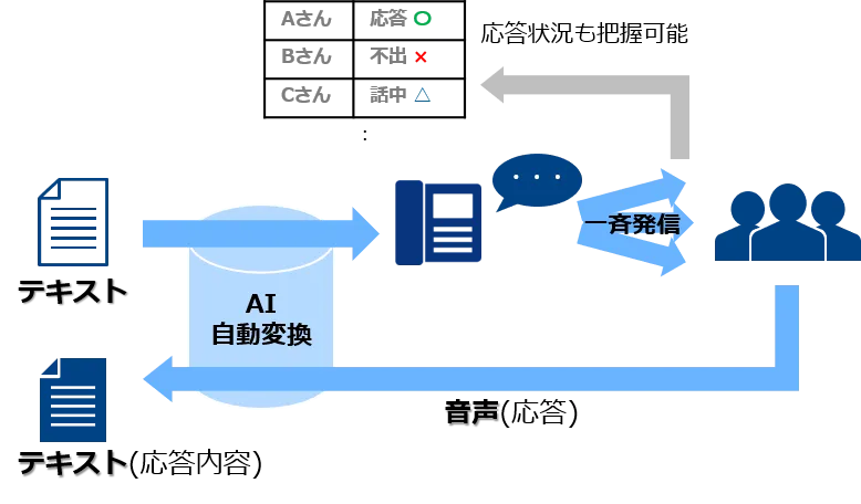 内容: 緊急時など、たくさんの相手に一斉に電話をかけることができるパッケージです。伝えたい内容をテキスト入力するだけで、AIがその内容を音声に変換し、電話を自動で発信します。応答状況の把握が可能であり、確実に情報を伝えたいときに活用できます。また、相手の応答内容をテキスト化することができるため、応答状況の可視化やそれによる一元管理が可能です。