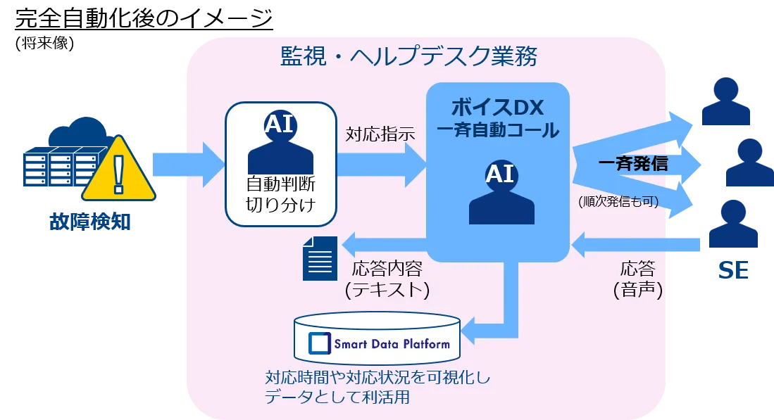 故障を検知した監視担当者が、SEに伝えたい内容をテキストで入力します。その内容をAIが音声に変換し、SEに対して一斉に電話を自動発信することで、確実に内容を伝えるトライアルを行います。また、SEが音声で応答した内容を自動でテキスト化し、応答状況の可視化と一元管理を行います。