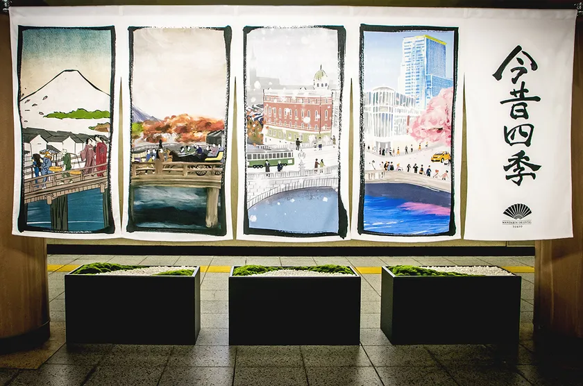 この度ののれんデザインは、当館が「センス・オブ・プレイス(Sense of Place)=立地する土地柄と文化に敬意を表するホテルづくり」というマンダリン オリエンタル ホテルグループの理念を、“現代の絵巻物風のれん”に置き換えた作品です。日本橋を象徴的に表す一枚の絵を、4コマ漫画をモチーフにした4枚の絵で構成し、ホテルが誕生するまでの日本橋の物語を、江戸時代から現代に至るまでの時代の流れと、四季の移り変わりで表現しています。その土地の歴史や伝統、文化を取り入れ、日本橋の歩みを大切にしながら未来へと進むのれんを見ていただくことにより、来街者に日本橋の魅力を感じていただきたいという思いが込められています。