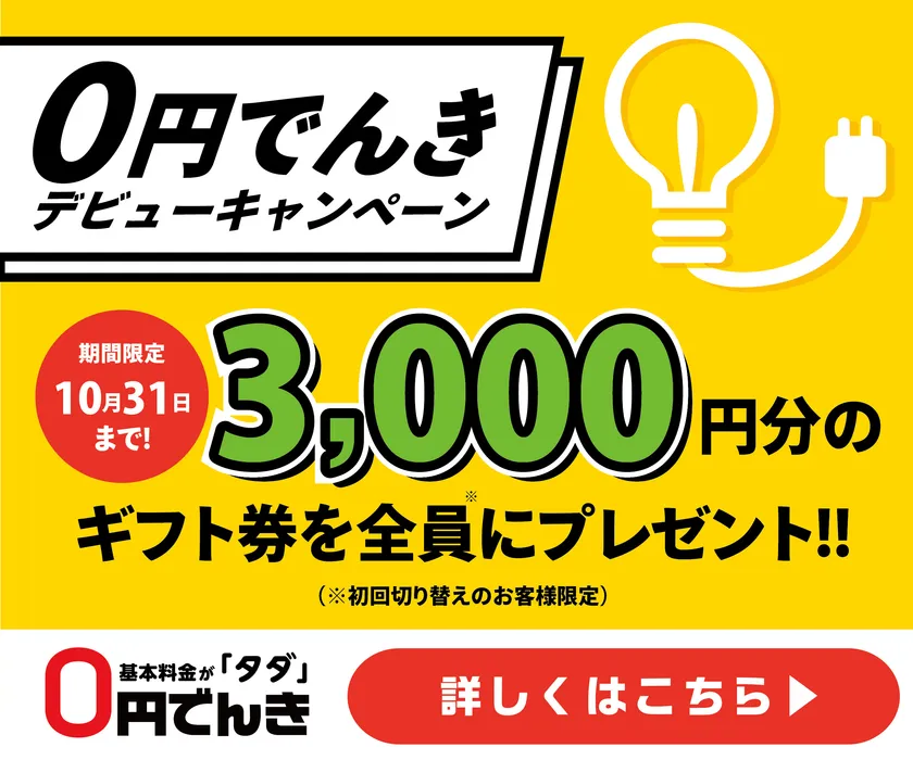 従来の電気料金プランでは、基本料金の支払いが必須でしたが、当社の「0円でんき」は、基本料金が無料であるため、単純な使用量のみの支払いを実現し、従来の料金体型よりも安い料金での電気の使用が可能となりました。契約アンペア数が高く、電気使用量の多い方ほど、従来よりも電気料金が安くなるシステムで、家庭向けのファミリープラン・事務所、飲食店向けのプランも取り揃えています。提供エリアは東京電力エリア(静岡県の一部除く)、申込はweb完結。契約後スマートメーターに交換し、利用開始。10月31日まで、0円でんきに切り替えて頂いた方全員にAmazonギフト券3,000円プレゼントのキャンペーンを実施。(ギフト券はメールタイプ、電力供給開始の翌月月末までに送付)