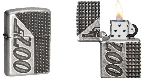 ジェームズ・ボンド「007」コレクションに追加されたZippoライターには、Zippoのアーマーアンティークシルバー仕上げの表面に深彫りの007ロゴが象徴的。