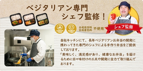 自社キッチンにて、長年ベジタリアンお弁当の開発に携わってきた専門のシェフによる手作り弁当をご提供しております。「美味しく、満足感があり、健康なお弁当」を届けるために日々味付けの工夫や開発に全力で取り組んでおります。