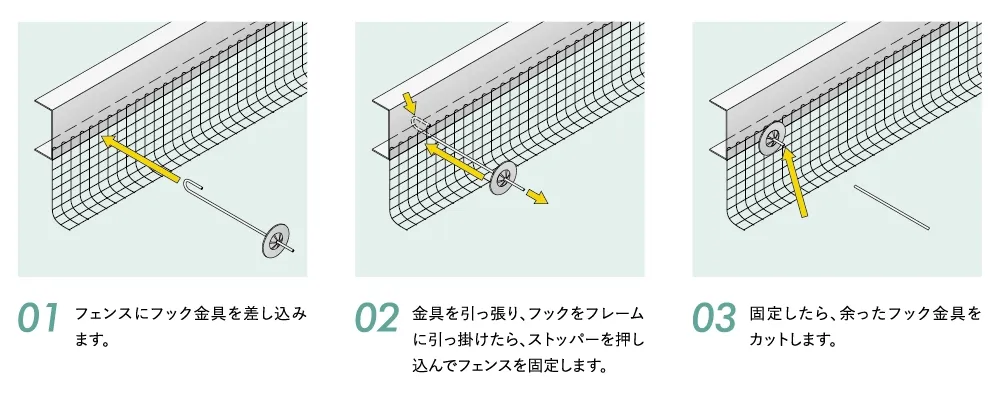 フェンスにフック金具を差し込み、フックを太陽光パネルのフレームに引っ掛けたら、ストッパーを押し込んでフェンスを固定するという簡単施工。従来と比べてスピーディでコストを抑えることが可能です。