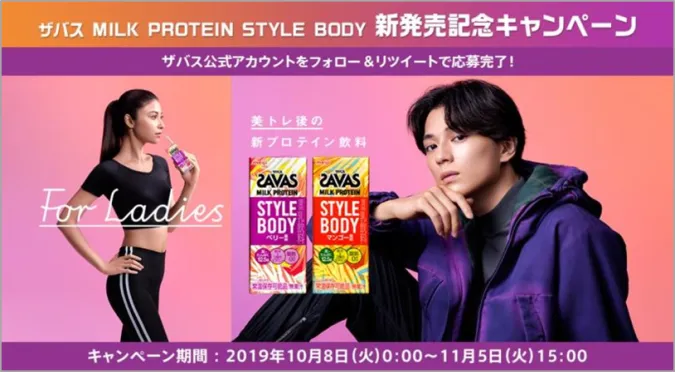 新商品発売とWEB動画公開を記念して、Twitter上で『ザバス MILK PROTEIN STYLE BODY 新発売記念キャンペーン』を10月8日(火)~11月5日(火)の期間を分けて計4回実施いたします。ザバス公式Twitterアカウントをフォローし、特定のツイートをリツイートするだけで応募できるキャンペーンです。月・水・金すべての動画をリツイートすると当選確率もアップいたしますので、ぜひご参加ください。