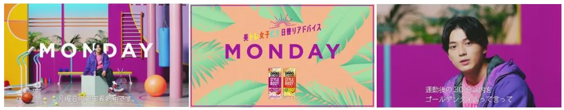 MONDAYの大きな文字が後ろに映し出され、日替わり月曜日の新田さんのシーンからCMは始まります。