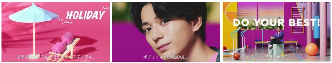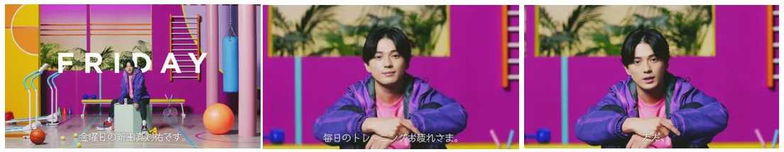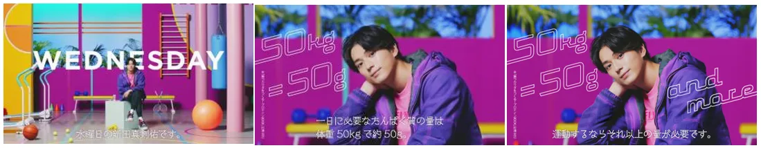 WEB動画「日替り美トレアドバイス」は、新田真剣佑さんが、月曜日、水曜日、金曜日の曜日替わりで、効果的なたんぱく質の摂取時間や量など、美トレに関する的確なアドバイスをしてくれるCMです。「頑張れ!」と声をかける様子など、美トレ女子やこれから身体作りを始めてみようという女子のやる気を奮い立たせてくれる内容でとなっており、新田真剣佑さんの優しい言葉とまなざしが印象的です。