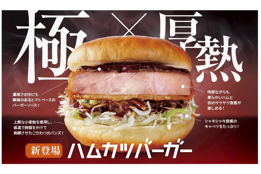 厚みのある懐かしい味わいのハムを、目の粗いパン粉でサクサクに揚げました。肉厚ながらも柔らかいハムの食感と、衣のサクサク感を同時に楽しめるバーガーです。中にはシャキシャキのキャベツをたっぷりサンドし、濃厚さの中にも酸味のあるトマトベースのバーガーソースを絡めました。バンズは、上質な小麦粉を使用し、低温で時間をかけて発酵させたコメダこだわりのバンズパンを使用しています。バーガーソースの酸味とハムの甘さがマッチしたバーガーは、子どもから大人まで、皆様に楽しんでいただけます。昭和世代には懐かしく、平成世代には新しい!?コメダの新バーガーを是非、ご賞味ください!