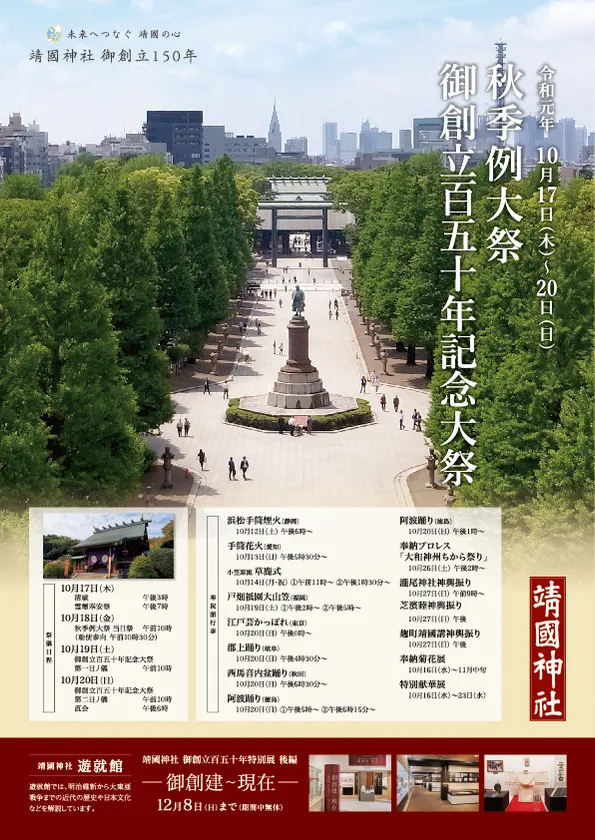 靖國神社は本年御創立百五十年を迎え、10月12日(土)~27日(日)まで毎週末、各地の伝統芸能などが御創立百五十年奉祝行事として奉納され、多くの方々で賑わうことが予想されます。