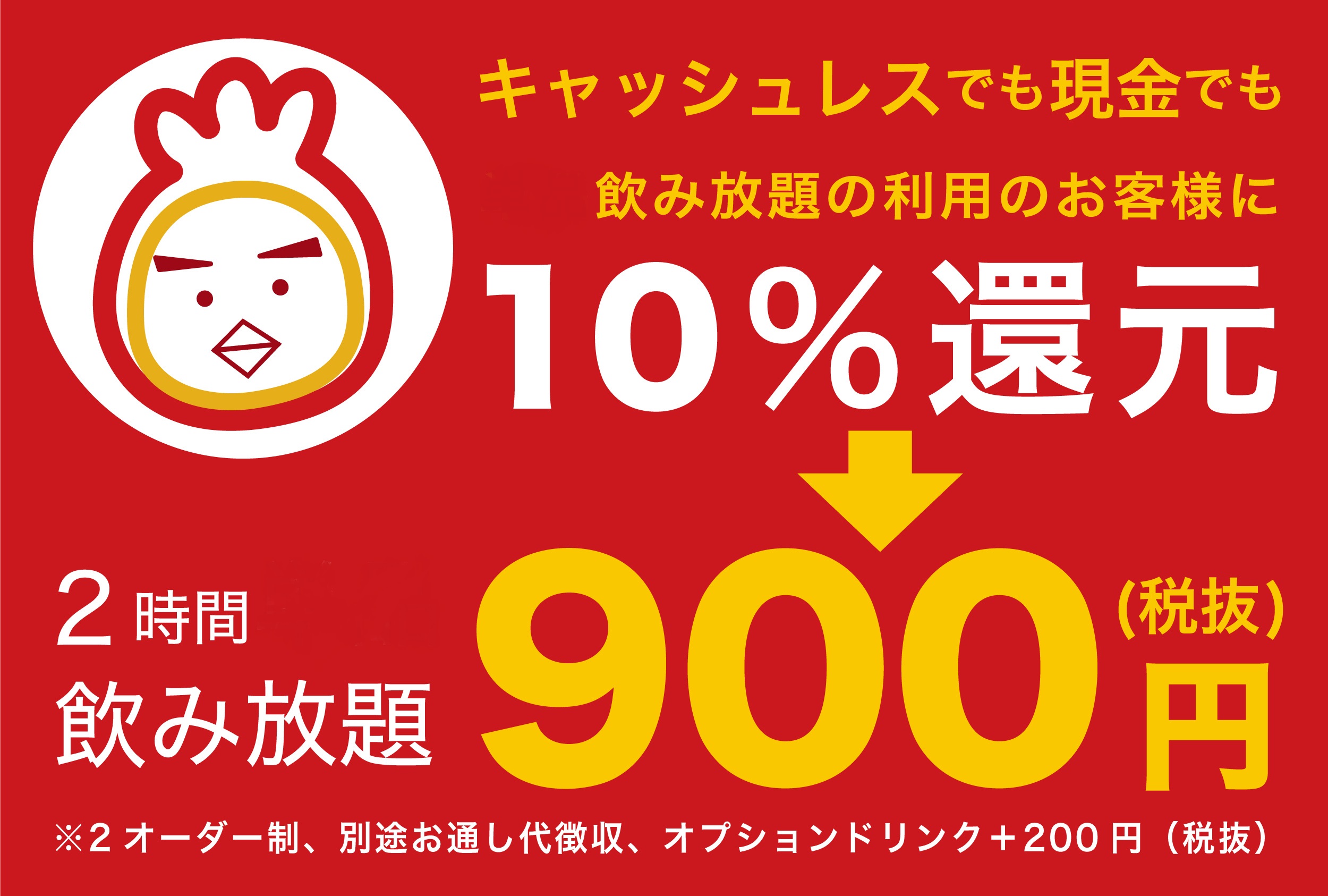 <通常の飲み放題お一人様1,000円のところ、10%還元した900円に割引!>