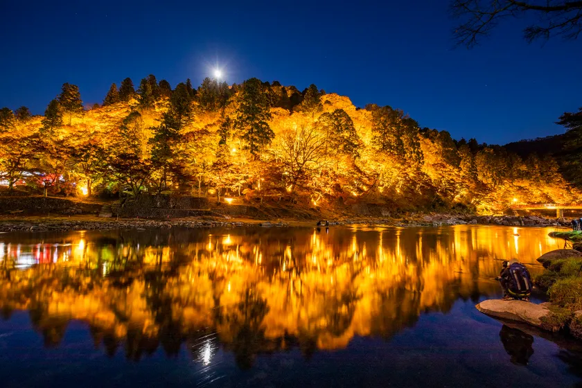 矢作川支流の巴川がつくる渓谷、香嵐渓(こうらんけい)は、日本でも屈指の紅葉スポットです。約4千本の紅葉が絶景を生み出しており、11月上旬から下旬にかけて「香嵐渓もみじまつり」が開催され、期間中は夜間(日没~午後9時)にライトアップされます。期間内は日中の色とりどりの山から一変し、幻想的な雰囲気を楽しむことができます。