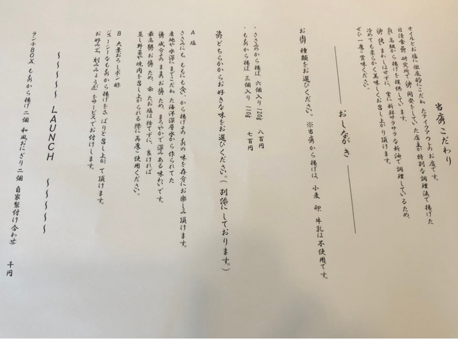 看板メニューの白い高級から揚げは、日清食品の研究所で油の開発をしていたオーナーが、こだわりの飲めるオイルと特別な調理法で作っています。常に新鮮サラサラな新油で調理しているため、胃もたれや胸焼けは皆無で、冷めてもしっとり柔らかく美味い唐揚げです。