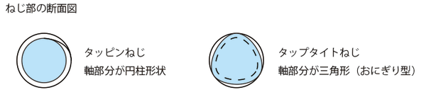 めねじ加工やインサートナットが不要のセルフタッピンねじです。ねじ胴部がおにぎり(三角)形状になっているため、ねじ込み時の抵抗が軽減され、ねじ込み後はゆるみ止め効果を発揮します。