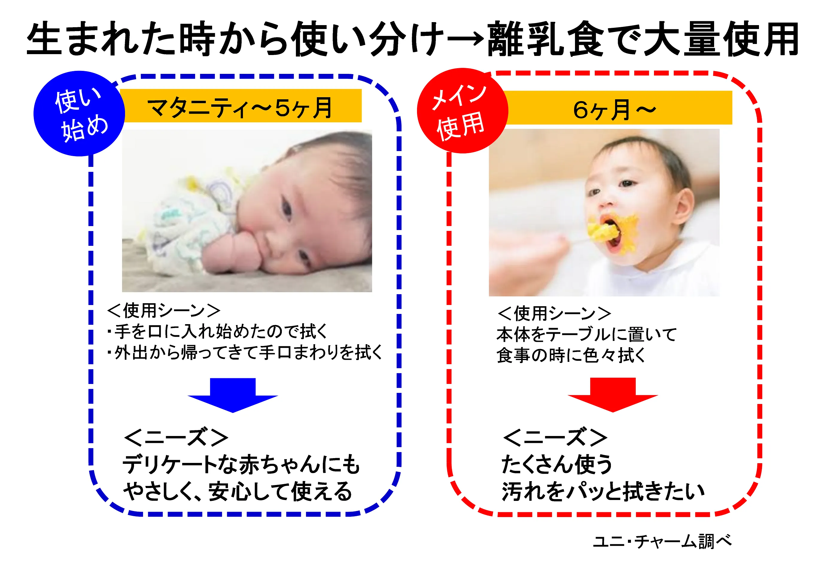 消費者の意識も「離乳食が開始する6か月から使う」(2016年)から「生まれた時からおしりふきと分けて使いたい」(2019年)に変化、赤ちゃんが0-5か月時の使用率も、27%から54%と大きく拡大しています。