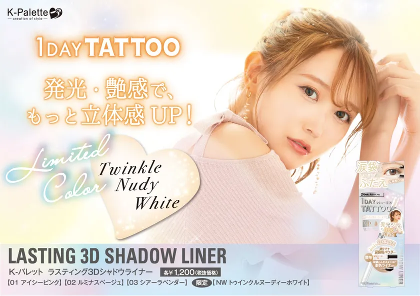 「K-パレット」より、ぷっくり「涙袋」とくっきり「ふたえ(※1)」で目元を大きくみせる「K-パレット ラスティング3Dシャドウライナー」から、発光したようなツヤ感でさらに目元の立体感がアップする「トゥインクルヌーディホワイト」が限定登場です。透明感の高いツヤと輝きを与える14種類のパールを高配合し、発光したようなツヤ感で立体感アップします。