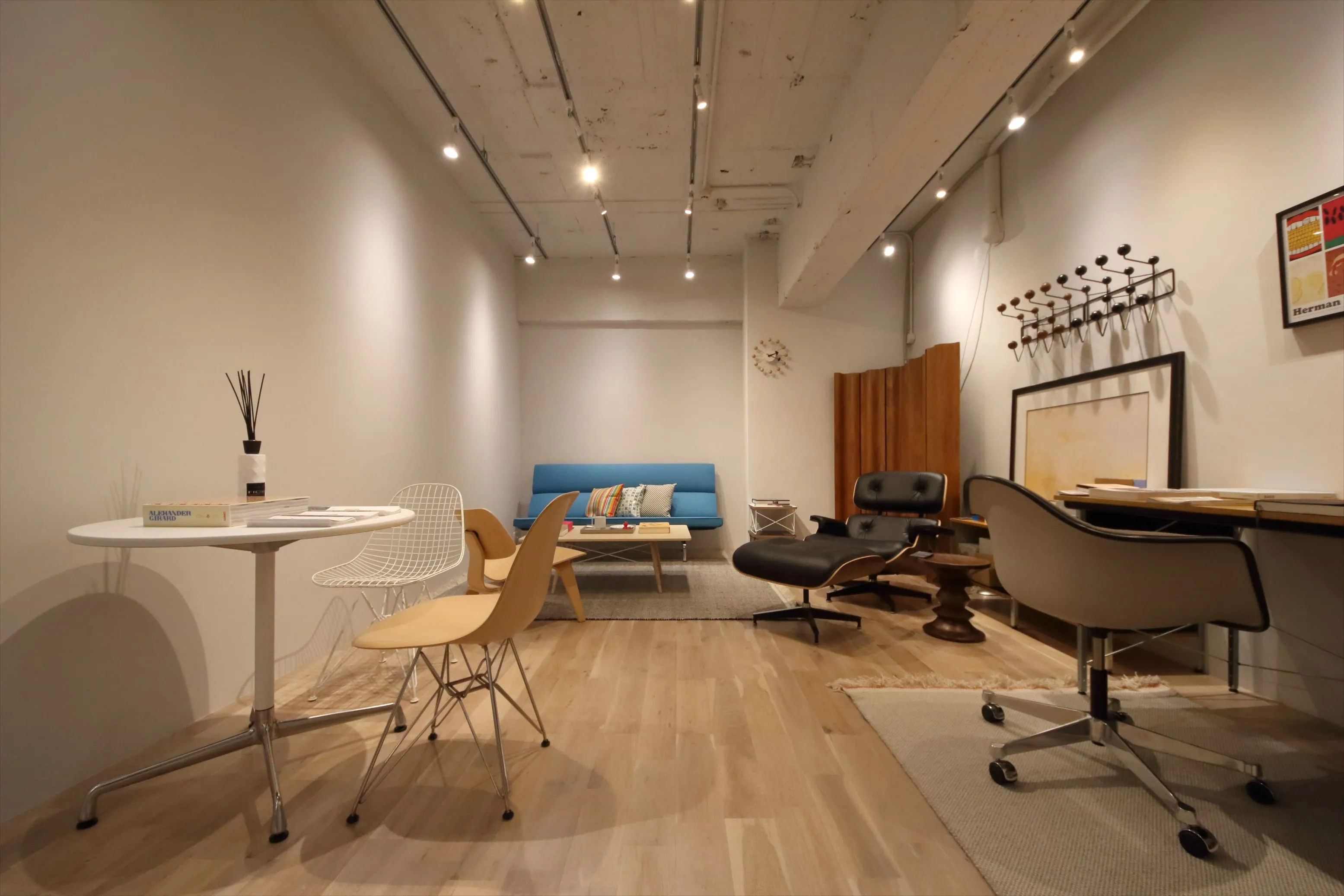 20世紀を代表するファニチャーデザインの一つとなった「イームズラウンジチェア&オットマン」をはじめ、ハーマンミラーコレクションの製品を数多く展示しています。