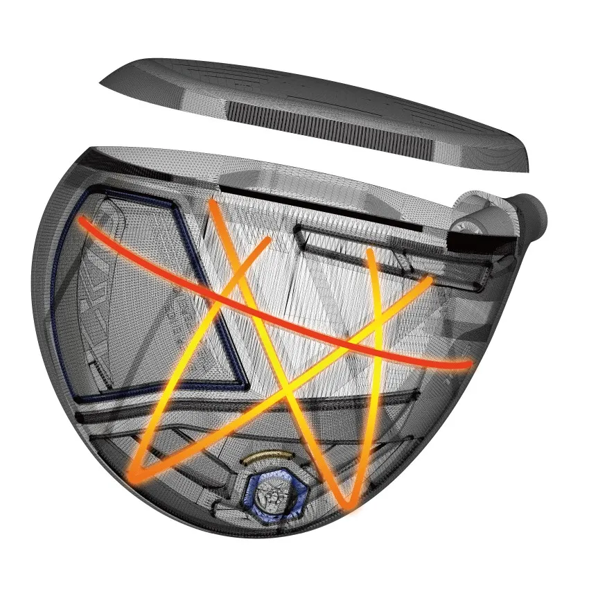 「カーボン複合構造」により、ソールに比重の軽いカー ボン素材を複合することで生じたフリーウエイトを後方に配置したことで慣性モーメントが増加し、広いスイート エリアを実現ました。