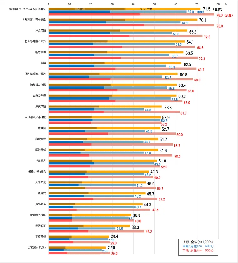 特に、全体では約7割を占めたトップ2の「高齢者ドライバーによる交通事故」「自然災害/異常気象」では、女性は8割近いスコアを示し、5人に4人が「不安」という高いレベルとなっています。