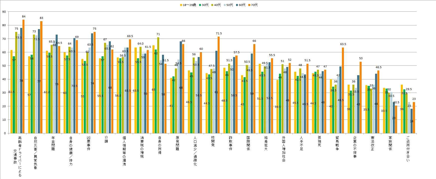 特に70代では8割を超える高スコアを示した「高齢者ドライバーによる交通事故」「自然災害/異常気象」のほか、「凶悪事件」「原発問題」「核開発」「国際関係」「貿易戦争」といった「危険性」や「争いごと」を伴う項目で、不安度が高くなるようです。