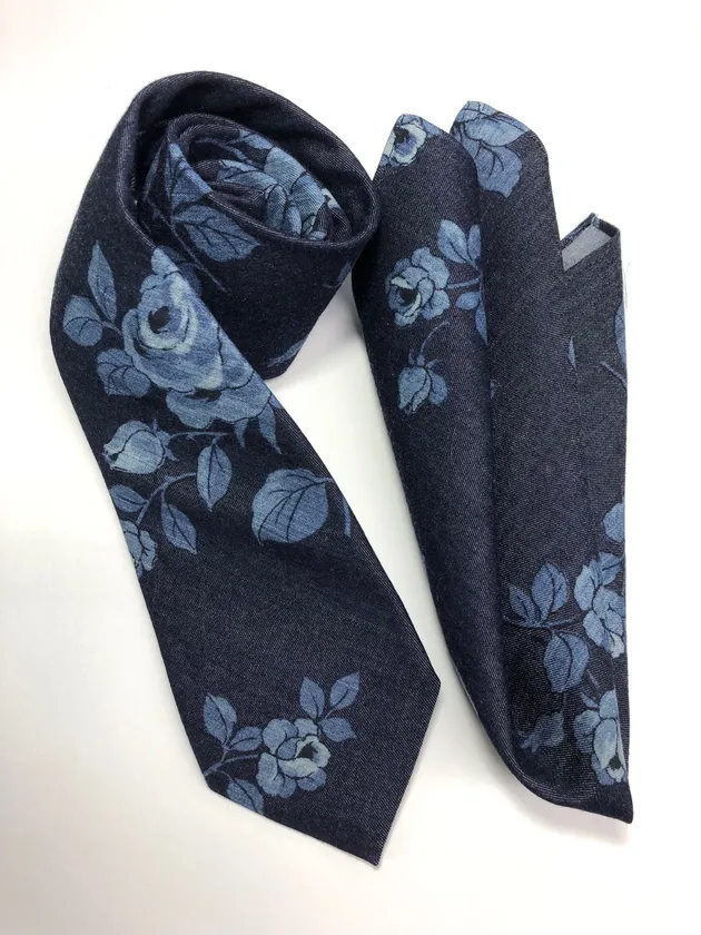 デニムパンツのループを格子状に編んだコースター(株式会社四川 700円+税)や、デニムパンツをリメイクしたバッグ(株式会社NO LIMIT FACTORY 9,000円+税)、福山の市花・ばらを特殊加工技術で描いたネクタイチーフセット(株式会社アクセ 3,900円+税)、一度染め上げたデニムから段落ち抜染してグラデーション状に色抜きをしたスニーカー・スリッポン・トートバッグ(山陽染工株式会社 15,000円~+税)、意匠登録されているWOOD DENIMを施したブックカバー(有限会社アルファ企画 7,400円~+税)、1着ずつ職人の手によって縫製されたデニム着物(青木被服株式会社 78,000円+税)など、備中備後デニムの魅力を伝える様々なアイテムを揃えます。