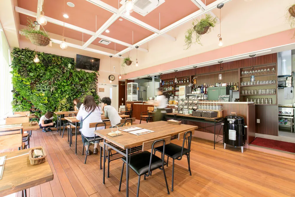 全108席を備えたカフェスペースでは、グリーンに囲まれたレイアウトでお客様に癒やしの空間をご提供いたします。屋外にある植栽と一体化したテラス席では、居心地の良い雰囲気とおいしい食事で、極上のひと時をお届けします。