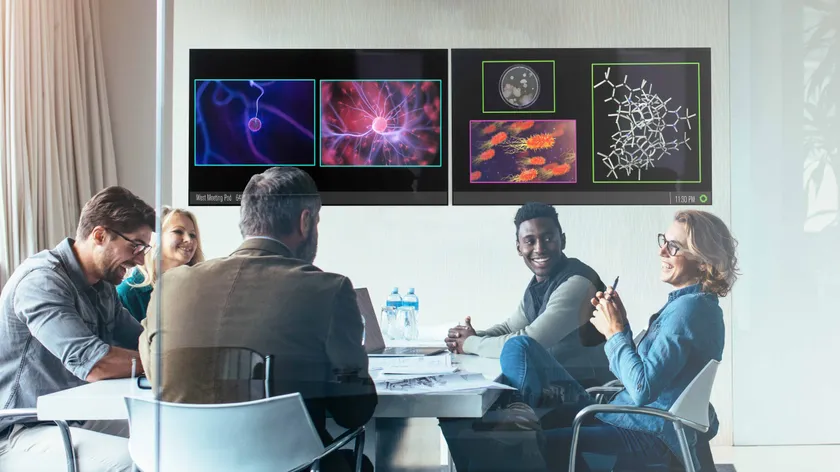 同時に複数のユーザーがコンテンツを共有できるだけでなく、1人のユーザーから複数のコンテンツをも同時に共有が可能、またネットワーク経由で離れた部屋間でもコンテンツ共有ができる「マルチルームセッション」機能、スマートフォンをポインター代わりにできる「INK」機能など、会議室でのコラボレーションに最適な製品です。
