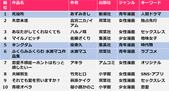 ユーザーの約8割が女性のめちゃコミックで上位にランクインされるということは、女性に主に読まれているということです。