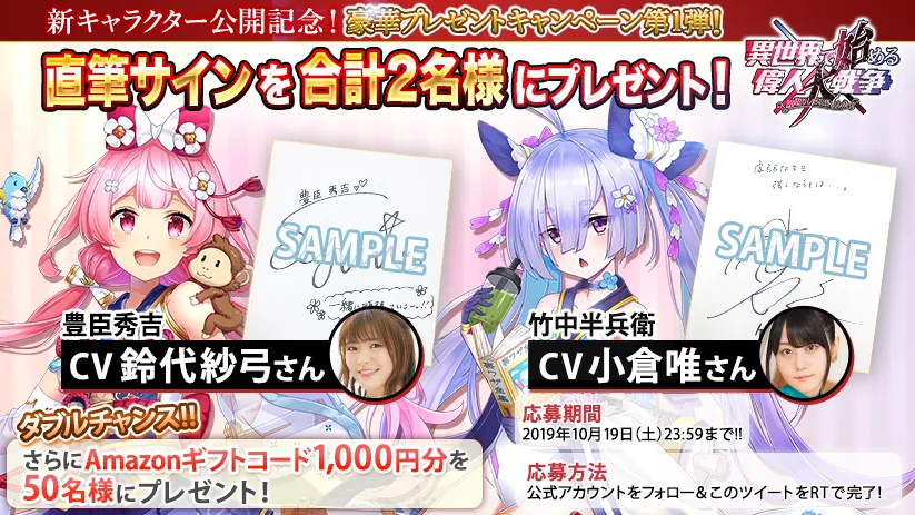 新キャラクター公開を記念して、豊臣秀吉役:鈴代紗弓さん、竹中半兵衛役:小倉唯さんのサイン色紙を抽選でそれぞれ1枚ずつ、計2名様にプレゼント!