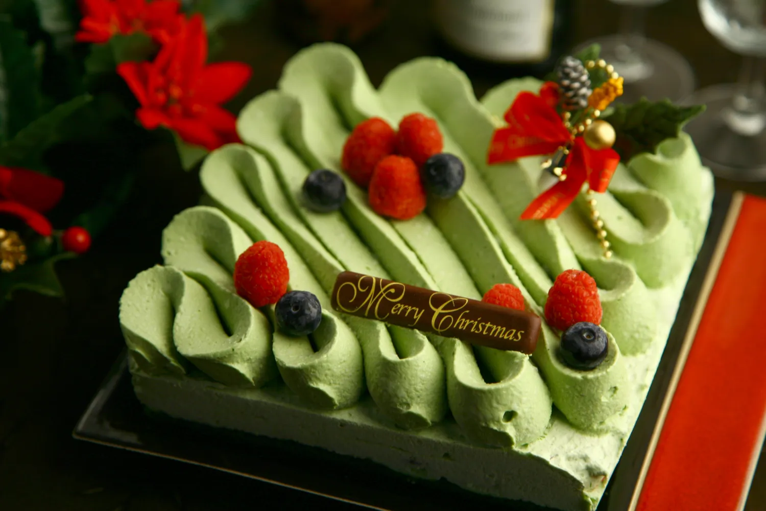独創的な絞り方をしたクリームの上に、2種類のベリーをあしらった『宇治抹茶チョコレートケーキ ~ショコラ・テ・ベール~』。土台には、抹茶スポンジケーキとあずき入りの抹茶ムースを敷きつめました。「抹茶とベリー」。この大胆な組み合わせは、甘いだけでなく、ほろ苦いだけでなく、もうひとつ新鮮な「驚き」を加えたいと職人が試行錯誤の中で見つけたもの。ベリーの酸味が、抹茶の風味やチョコレートの甘さに良く合います。クリスマス限定の特別な抹茶チョコレートケーキです。
