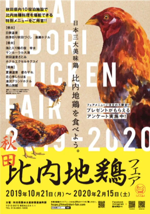 秋田県農林水産部畜産振興課では、令和元年10月21日(月)から令和2年2月15日(土)までの期間、秋田県内において「秋田比内地鶏フェア」を実施いたします。