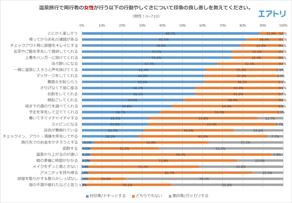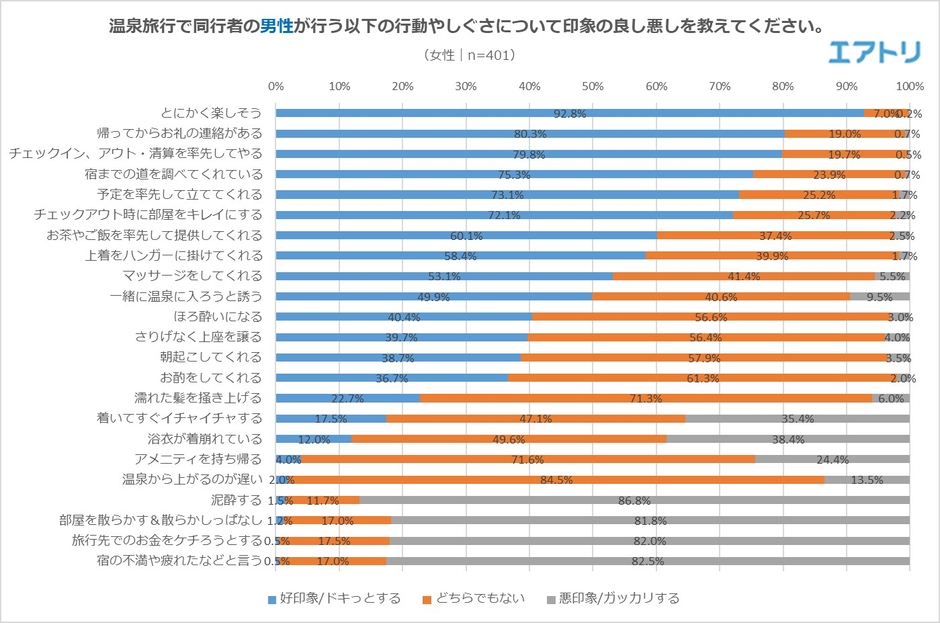 逆に「悪印象/ガッカリする」の回答が多かったのが、「泥酔する」(悪印象/ガッカリする:86.8%)、「宿の不満や疲れたなどと言う」(悪印象/ガッカリする:82.5%)、「旅行先でのお金をケチろうとする」(悪印象/ガッカリする:82.0%)、「部屋を散らかす&散らかしっぱなし」(悪印象/ガッカリする:81.8%)となりました。男性の回答と比較すると「チェックイン、アウト・清算を率先してやる」が好印象の3位、「旅行先でのお金をケチろうとする」が悪印象の3位に入っており、男性はお金の使い方や率先して支払う姿勢も求められているようです。