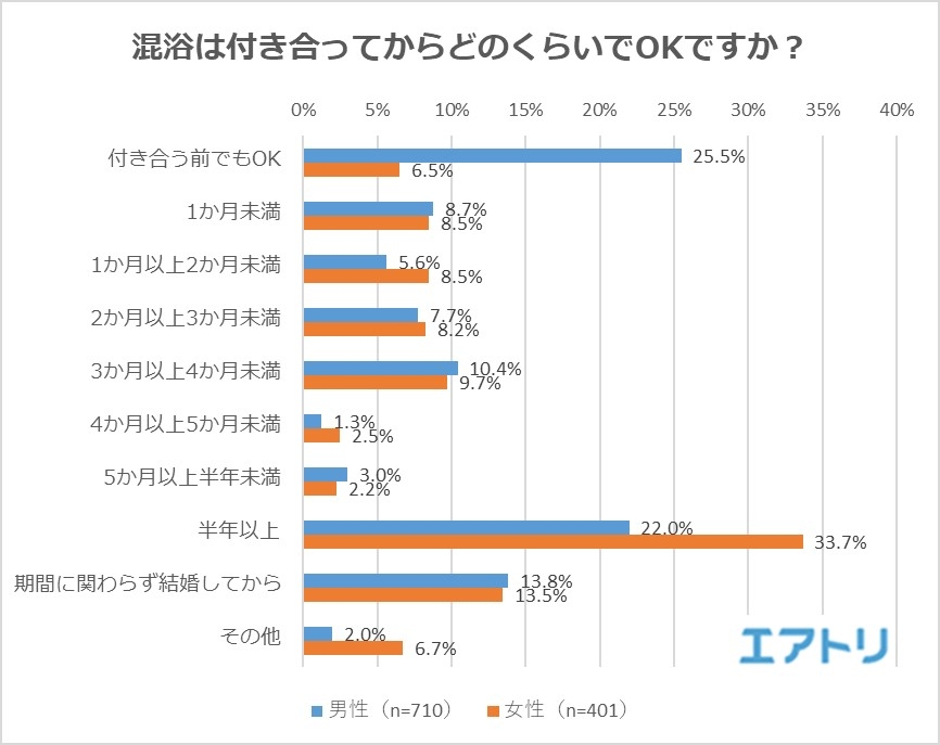 ―「付き合う前でもOK」と回答したのは男性の場合、温泉旅行:34.1%、混浴:25.5%だったのに対し、女性は温泉旅行:17.0%、混浴:6.5%と大きく差が出ました。