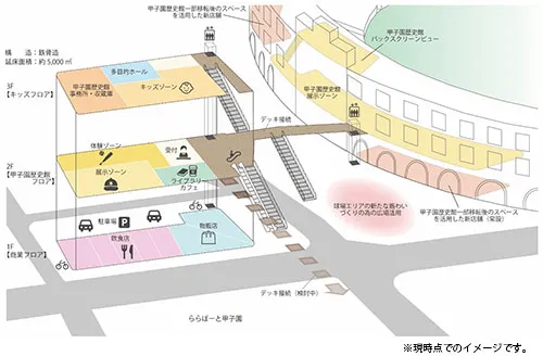 また、この建物と球場をデッキで接続することとし、甲子園歴史館を訪れる皆さまの回遊性を高めるほか、交差点の安全性を向上させ、球場とこの建物を一体的に運営することで相乗効果を高め、球場を拠点とした新たなにぎわいの創出を目指します。