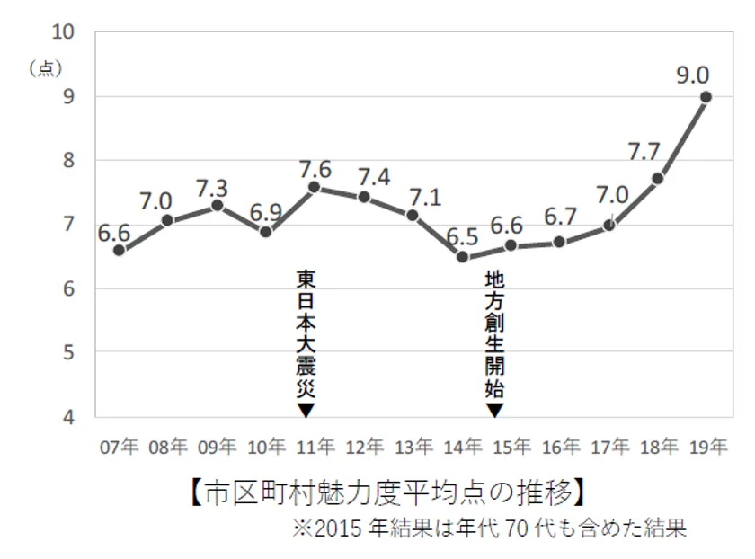 1,000市区町村の魅力度平均点が2019年は9.0点と、調査対象に町村区を加えた2007年以降過去最高点となっている。