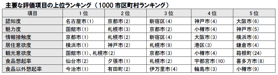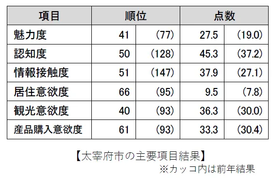 認知度は前年37.2点(128位)から45.3点(50位)に8.1ポイント、情報接触度は前年27.1点(147位)から37.9点(51位)に10.8ポイントと、それぞれ大幅に上昇。過去10年で最も点数が高くなっており、同市の周知性が高まっている。
