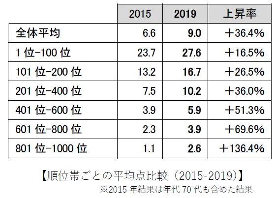 同様に他の順位帯の平均点を比較すると、すべての順位帯での平均点が上昇しており、特に順位が低い層になるほど上昇率が大きくなる傾向となっている(下図参照)。