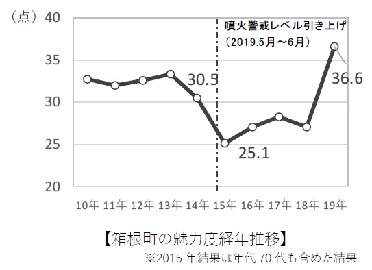同町の過去10年の魅力度推移をみると、2014年までは30点台で推移していたが、火山性地震の活発化等に伴う噴火警戒レベルが引き上げられた2015年には25.1点に大きく点数が低下している。以降、20点台後半で推移していたが2019年に大きく上昇し、2014年以前の点数水準に回復した。