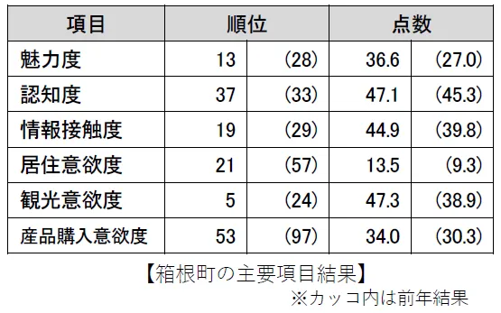 魅力度が前年から最も上がったのは箱根町で、27.0点(28位)から36.6点(13位)と9.6ポイント上昇した。そのほかの項目では、観光意欲度が38.9点(24位)から47.3点(5位)と大きく順位・点数を上げている。