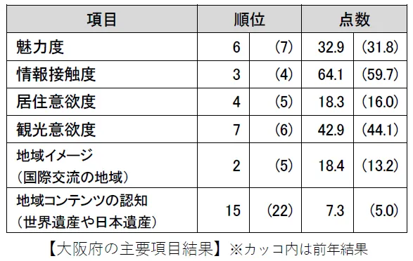 都道府県結果では、大阪府が6位と自己最高位、居住意欲度でも4位と自己最高位となっている。その他の結果では、「2025大阪万博」(2018年11月決定)や、今年6月に実施されたG20などに関連性のある地域イメージ項目「国際交流の地域」が2位に上昇。また、今年7月に世界文化遺産登録が決定した「百舌鳥・古市古墳群」に関連して、地域コンテンツの認知項目「世界遺産や日本遺産」で前年22位から15位に順位を上げている。