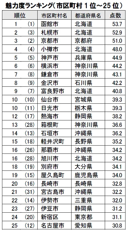 全国で最も魅力的な都道府県は北海道となりました。北海道は2009年に都道府県を調査対象に加えて以来11年連続での1位という結果となりました。市区町村は函館市が53.7点で2年連続6度目の1位となりました。2位は前年3位の札幌市、3位は前年2位の京都市という結果となっています。