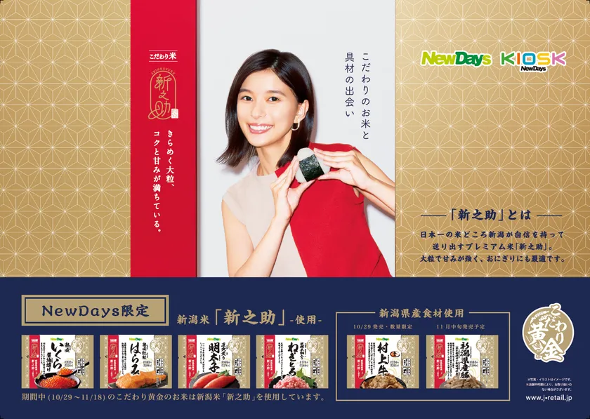 株式会社JR東日本リテールネット(本社:東京都新宿区西新宿/代表取締役社長:高橋眞)はNewDays、NewDays KIOSKで展開するおにぎりのオリジナルブランド「こだわり黄金(こがね)※」において、期間限定で新潟県のブランド米「新之助」を使用いたします。さらに、新潟県産の村上牛や豚肉を使用した具材も登場します。