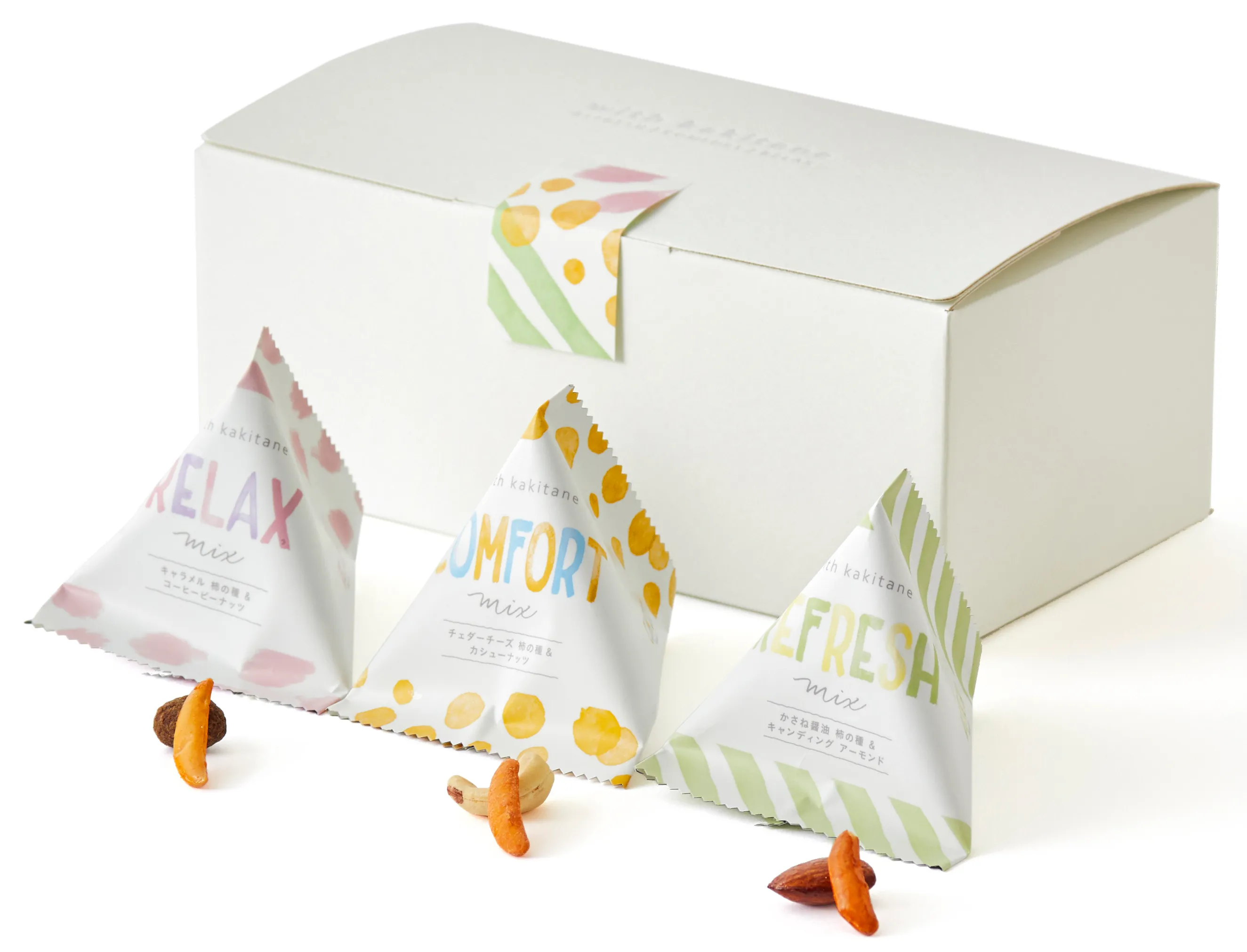 気分に合わせて選べるように、柿の種とナッツを組み合わせた、3種類のアソートをご用意しました。カリッと食感が心地よい「かさね醤油柿の種&キャンディングアーモンド」。コクのある味わいを楽しむ「チェダーチーズ柿の種&カシューナッツ」。甘さと香りを楽しむ「キャラメル柿の種&コーヒーピーナッツ」。気分に合わせて、お好きな味をお選びいただけます。