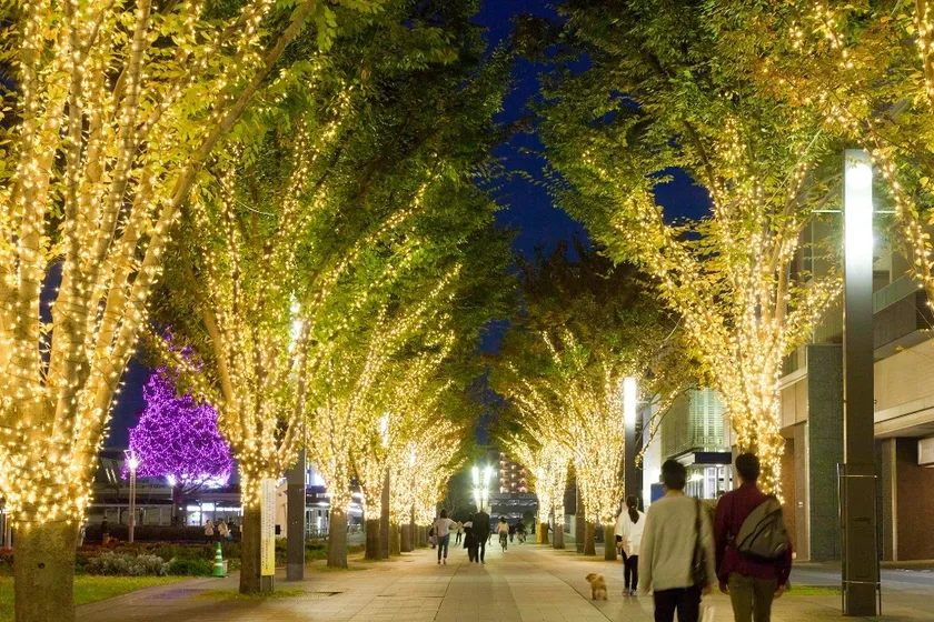 ・18万球のシャンパンゴールドで彩られる、LEDイルミネーションの並木道