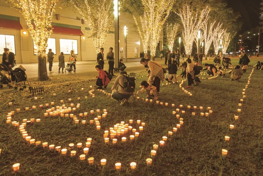 地域の小学生がお絵かきしたカップを絵文字に並べてキャンドルが灯ります。