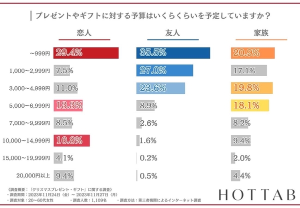恋人・友人・家族それぞれで1番多い回答は『〜999円(恋人:29.4%、友人:35.5%、家族:20.9%)』となりました。