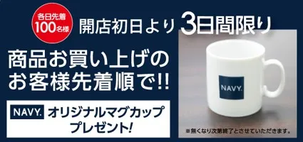商品をお買い上げのお客様先着順で、各日100名様に「NAVY」オリジナルマグカップをプレゼント致します。