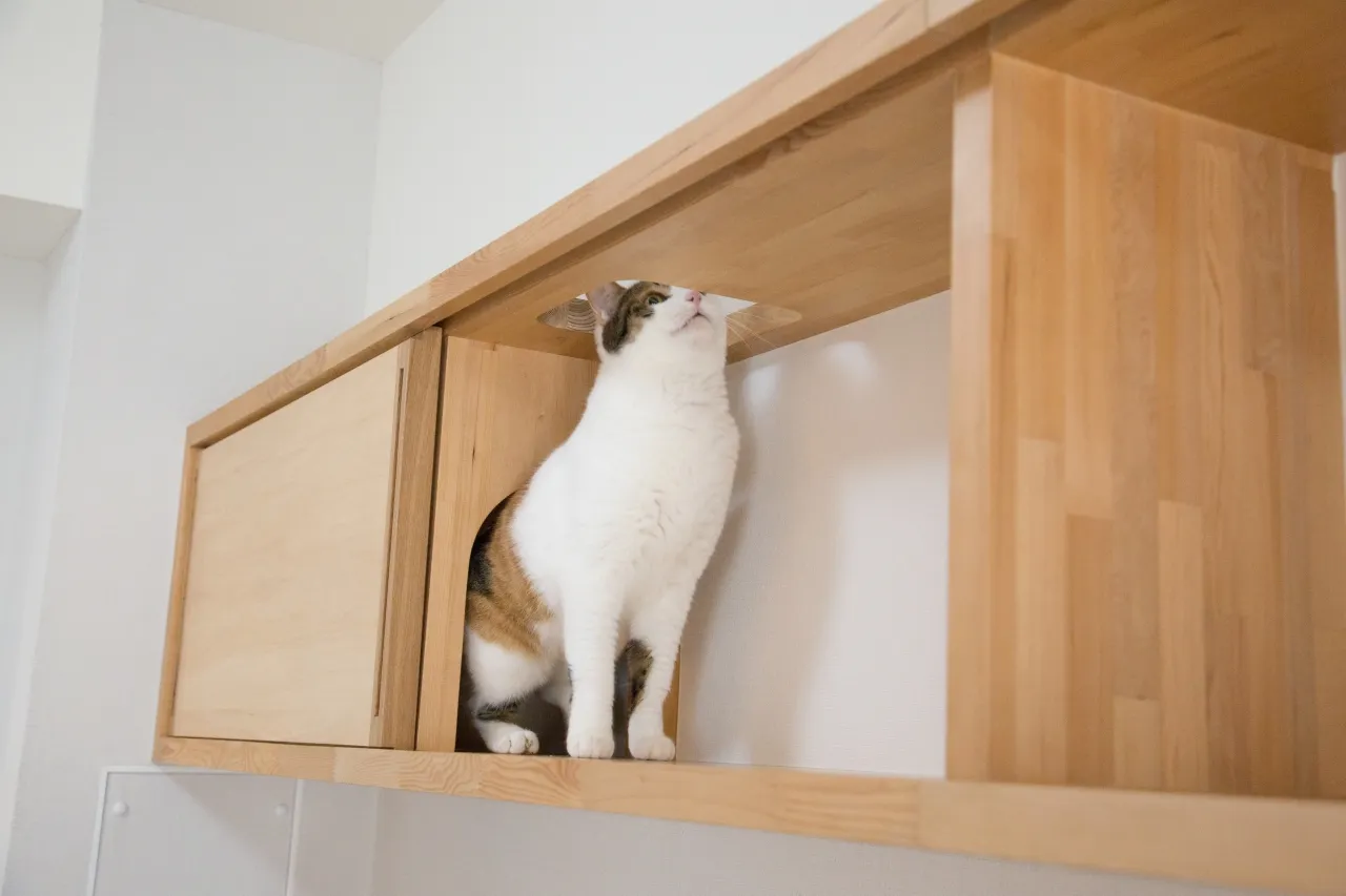 マイリノペットforねこでは猫も人も快適で健康に過ごせるオリジナル家具製作を行います。「マイリノ・キャビネット」は、部屋と一体化した猫のためのスペースです。縦運動が好きな猫が、壁と天井を自由に行き来できるようにし猫の運動不足を解消します。