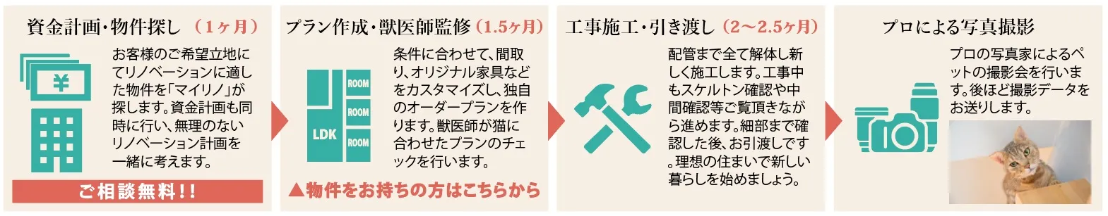 | ■マイリノペット コンセプト マイリノペットが目指すのは、ペットと人が健康に快適に過ごせる住空間です。田園調布動物病院 田向院長監修のもと、ペットの健康と人の生活に寄り添う環境をつくりあげます。 ペットと快適に暮らすリノベーションのCASE001,CASE002は猫がテーマ。自身も3匹の猫を飼っている田向院長と共に猫の健康や人間の生活に寄り添ったプランを作成しました。 インテリアの雰囲気にあわないキャットタワーやどんどん増えていく猫用品の行き場、毎日のトイレ掃除の手間など、猫との生活で発生する悩みをリノベーションで解決します。 |