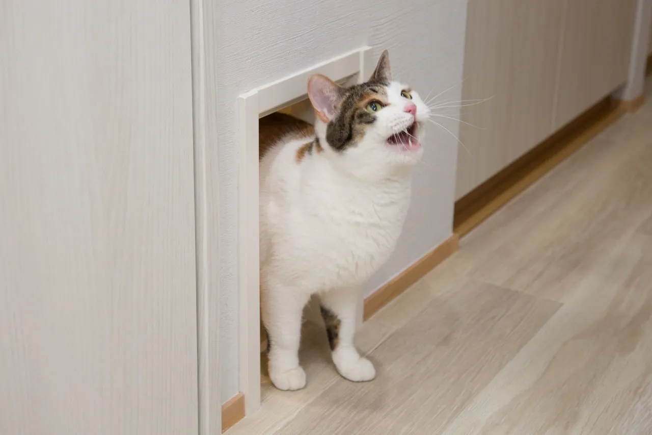 猫トイレのある洗面室は、猫がいつでも使えるように、猫専用入り口を作っています。